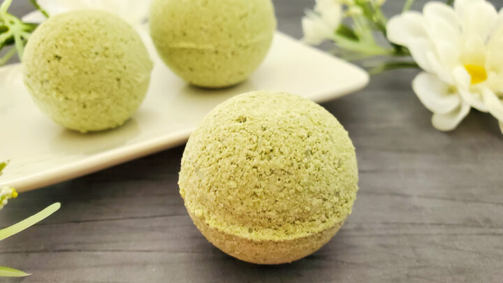 Homemade lemongrass bath bombs are naturally colored with French green clay and scented with essential oil.