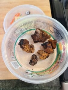 frozen chaga mushroom chunks, ready to be brewed into their next batch of chaga tea.